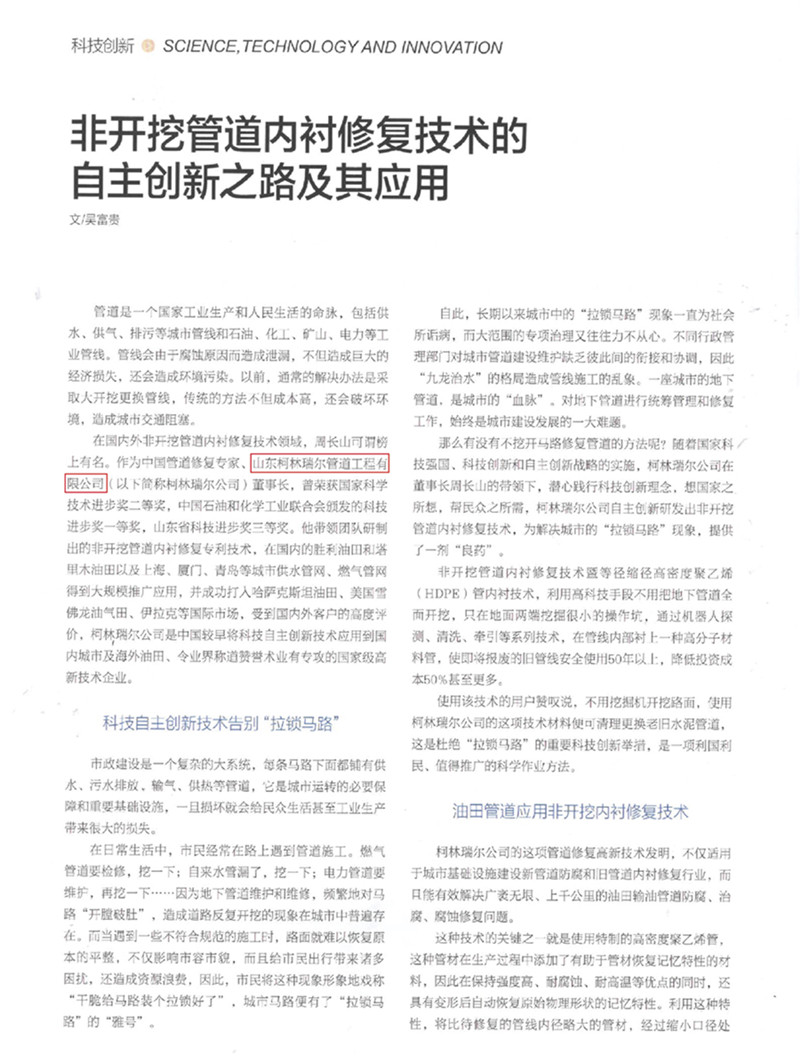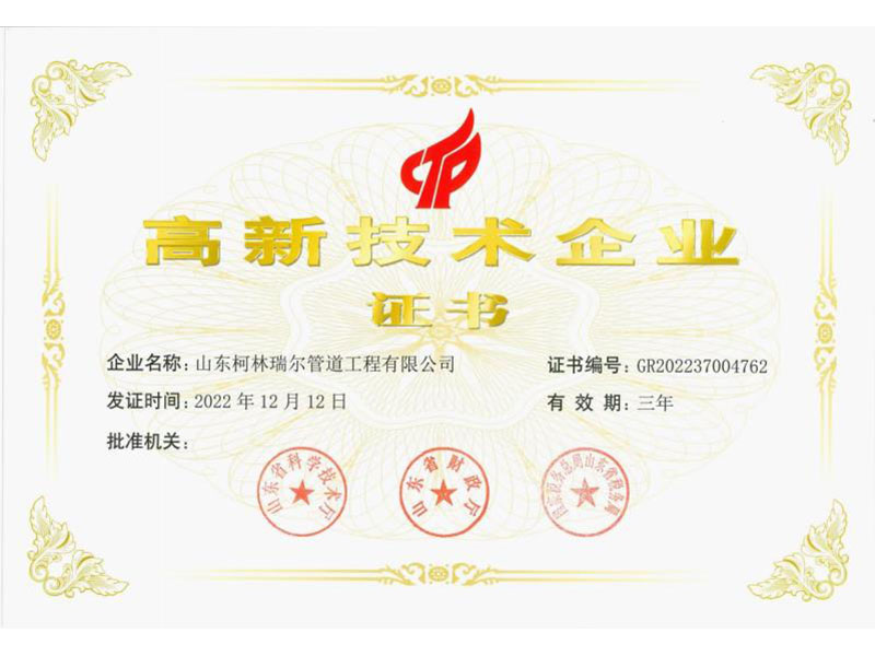 山東柯林瑞爾管道工程有限公司是國家級高新技術(shù)企業(yè),水資源節(jié)約與保護(hù)產(chǎn)業(yè)創(chuàng)新聯(lián)盟理事單位。公司與中國石油大學(xué)(華東)、北京化工大學(xué)等多家知名院校和國家實(shí)驗(yàn)室建立了長期密切的合作關(guān)系。公司被評為“山東省專利明星企業(yè)”,“質(zhì)量信得過單位”,“企業(yè)信用AAA級單位”,山東省“專精特新”企業(yè)。